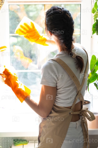 Женщина в резиновых перчатках и фартуке крупным планом вручную моет окно дома тряпкой и шваброй внутри интерьера с домашними растениями на подоконнике. Восстановление порядка и чистоты, уборка сервиза