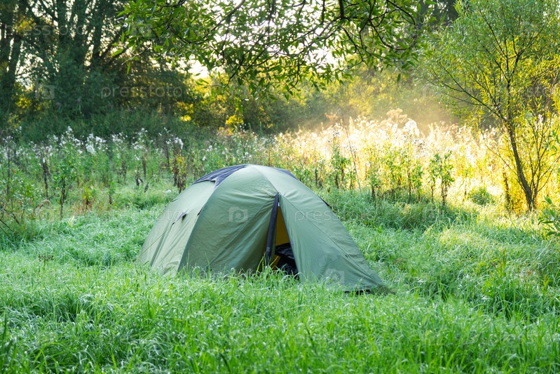 Установлена туристическая палатка в кемпинге на природе в лесу. Внутренний туризм, активные летние каникулы, семейные приключения. Экотуризм, спорт, поход. Копировать пространство, высмеивать
