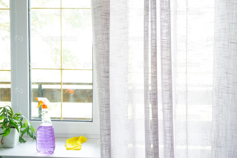 Оконные чистящие средства лежат на подоконнике тряпкой, спреем, моющим средством. Весенняя уборка в доме, уборка