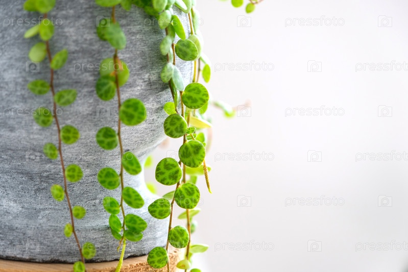 Длинные ресницы пеперомия свисают в бетонном горшке с круглыми черепаховыми листьями. Пеперомия крупным планом в интерьере на белом фоне, декоративное растение