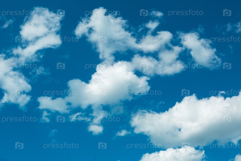 Белые кучевые облака в голубом небе. Фон с рисунком высоколучевых облаков. Погода, сезонность, экология, чистое небо. Мир
