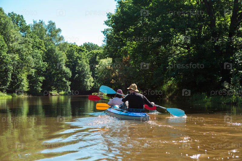 Мужчина и женщина пара в семейном байдарочном путешествии на гребном катере по реке, водный поход, летнее приключение. Экологичный и экстремальный туризм, активный и здоровый образ жизни