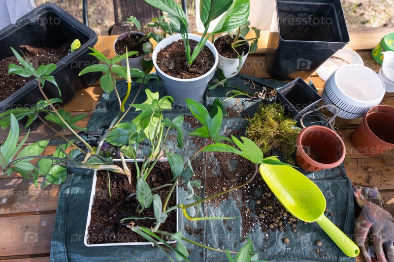 Растения на открытом воздухе на столе флориста для пересадки в открытый плантатор. Выращивание комнатных растений на открытом воздухе для озеленения
