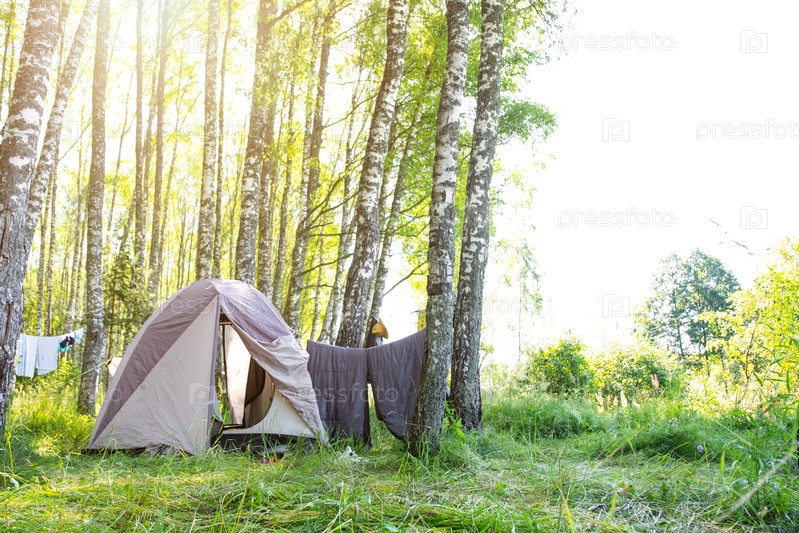 Установлена туристическая палатка в кемпинге на природе в лесу. Внутренний туризм, активные летние каникулы, семейные приключения. Экотуризм, спорт, поход. Копировать пространство, высмеивать