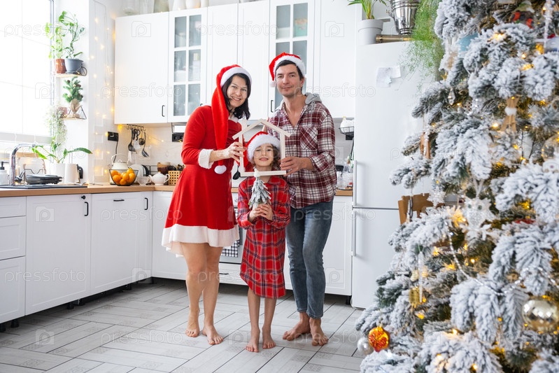 Счастливая семья в шляпах санта с крошечным домом в уютном доме с рождественским декором праздничной белой кухни. Подарок на Новый год. Страхование, переезд в новый дом, ипотека, аренда и покупка недвижимости