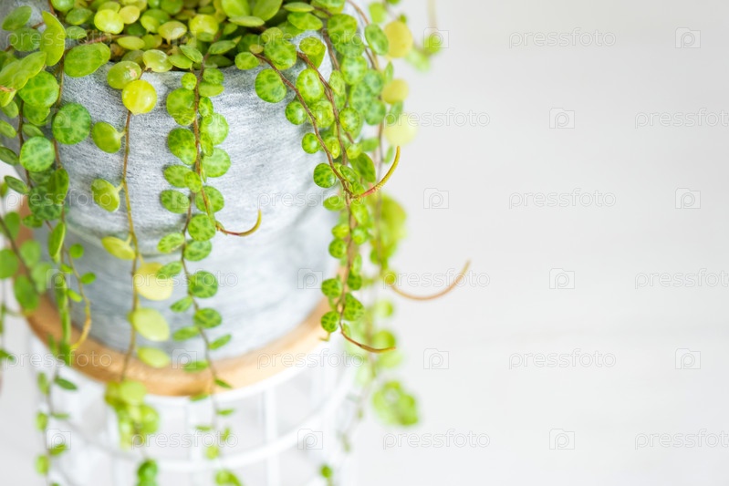 Длинные ресницы пеперомия свисают в бетонном горшке с круглыми черепаховыми листьями. Пеперомия крупным планом в интерьере на белом фоне, декоративное растение