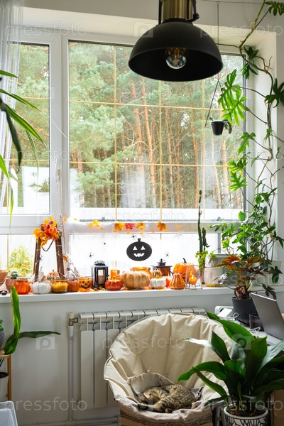 Праздничный декор дома на подоконнике к Хэллоуину в интерьере с домашними горшечными растениями- тыквами, Джеком о фонарях, черепами, скелетами, свечами и гирляндами - уютное и страшное настроение