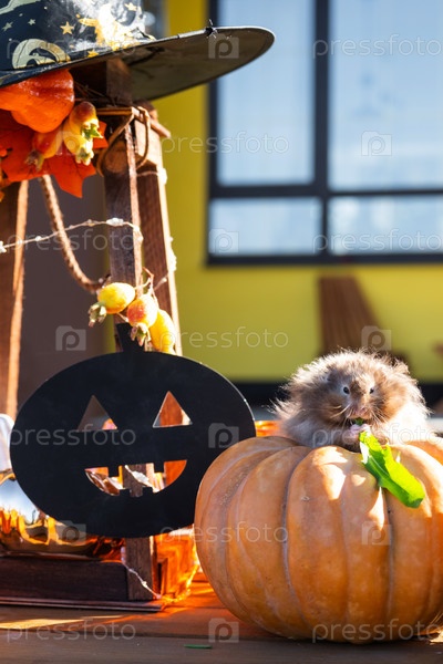 Забавный лохматый пушистый хомяк сидит на открытом воздухе на тыкве в декоре Хэллоуина среди гирлянд, фонарей, свечей. Фестиваль урожая