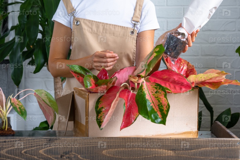 Женщина распаковывает коробку с посылкой горшечных цветов красного аглаонема - заказ завернутых тропических растений, доставка. Продажа, безопасная отправка растений из магазина, упаковка. Цветочный магазин, домашний бизнес