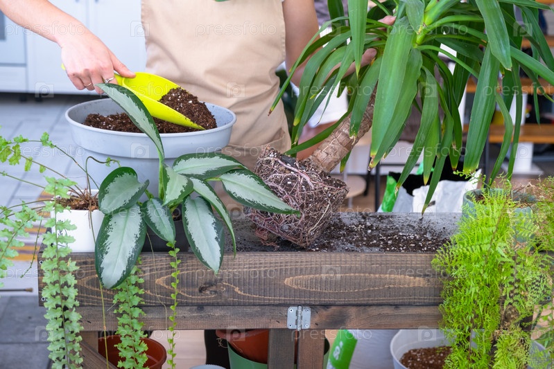Пересадка и уход за домом растения Юкка в новый горшок в интерьере дома. Женщина разводит и выращивает растения хобби, держит тропическое растение Дракена