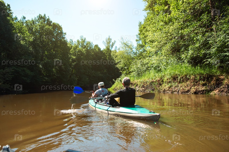 Семейная поездка на байдарках. Пожилая супружеская пара гребля на лодке по реке, поход по воде, летнее приключение. Возрастные виды спорта, умственная молодость и здоровье, туризм, активная старость
