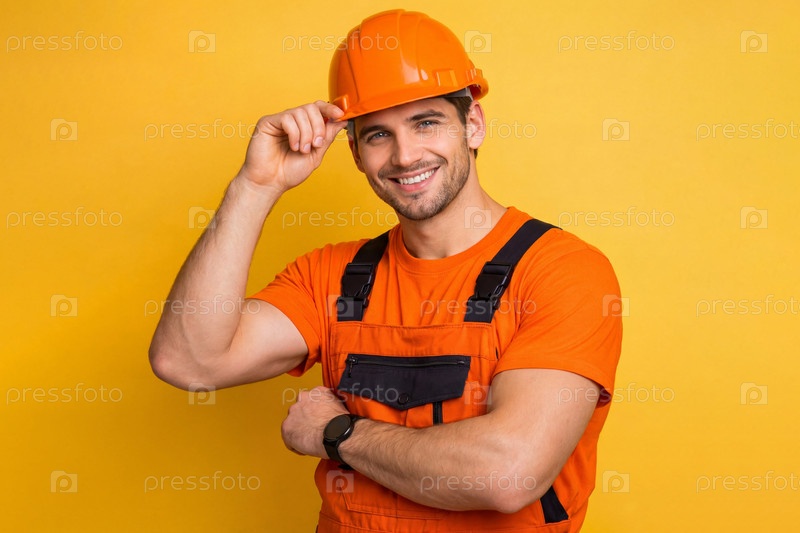 Студийный портрет строителя в ярко-оранжевом рабочем комбинезоне и защитной каске, поправляет каску одной рукой, скрещенные мощные руки с наручными часами на однотонном желтом фоне — промышленная тематика, безопасность труда, место для текста
