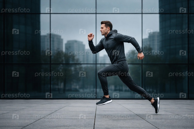Энергичный городской бег: молодой мужчина в темном спортивном костюме и кроссовках в динамичном прыжке на фоне зеркального стеклянного фасада современного офисного здания, утреняя урбанистическая атмосфера, фитнес и активный образ жизни