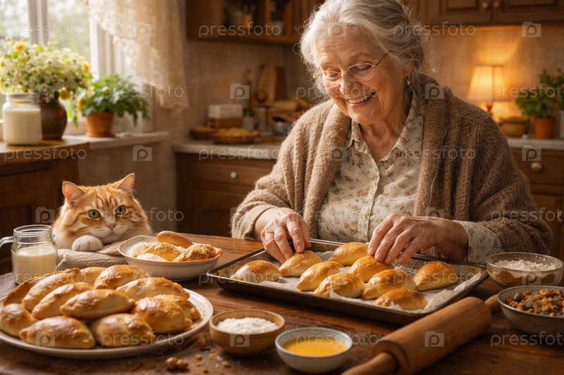Уютная деревенская кухня — пожилая женщина раскладывает золотистые домашние пирожки на противне, на столе миски с начинкой, яйцом и мукой, рядом любопытный рыжий кот