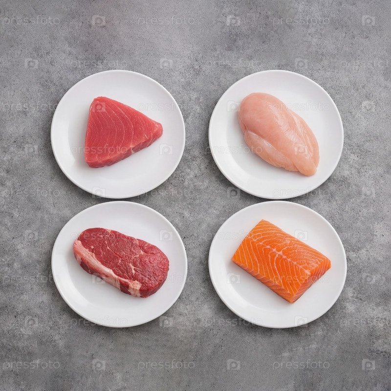 Вид сверху — четыре белые тарелки с сырыми кусками белкового филе: тунец, куриная грудка, говяжий стейк и филе лосося на текстурированном сером бетонном фоне