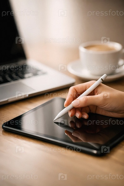Рука с цифровым стилусом на сенсорном планшете на фоне ноутбука и чашки кофе — современное рабочее место фрилансера, удаленная работа и креативный цифровой дизайн
