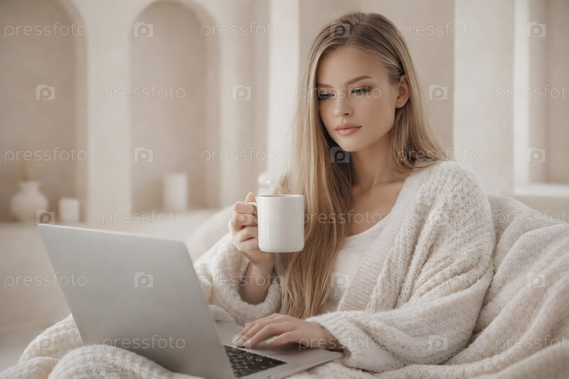 Уютное утро: женщина в теплом вязаном кардигане с кружкой кофе работает за ноутбуком в светлой гостиной — удаленная работа и домашний комфорт