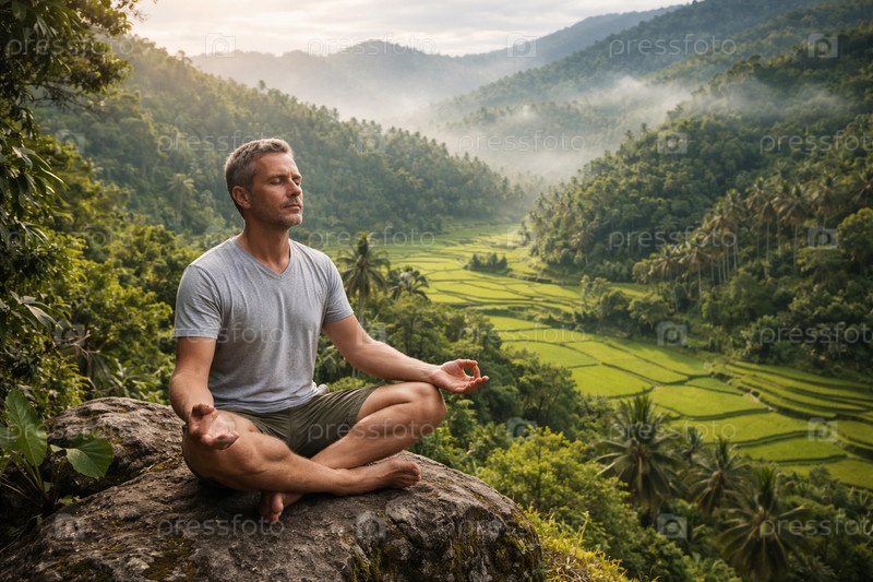Мужчина медитирует в позе лотоса на скале с видом на террасные рисовые поля в тропической долине на рассвете