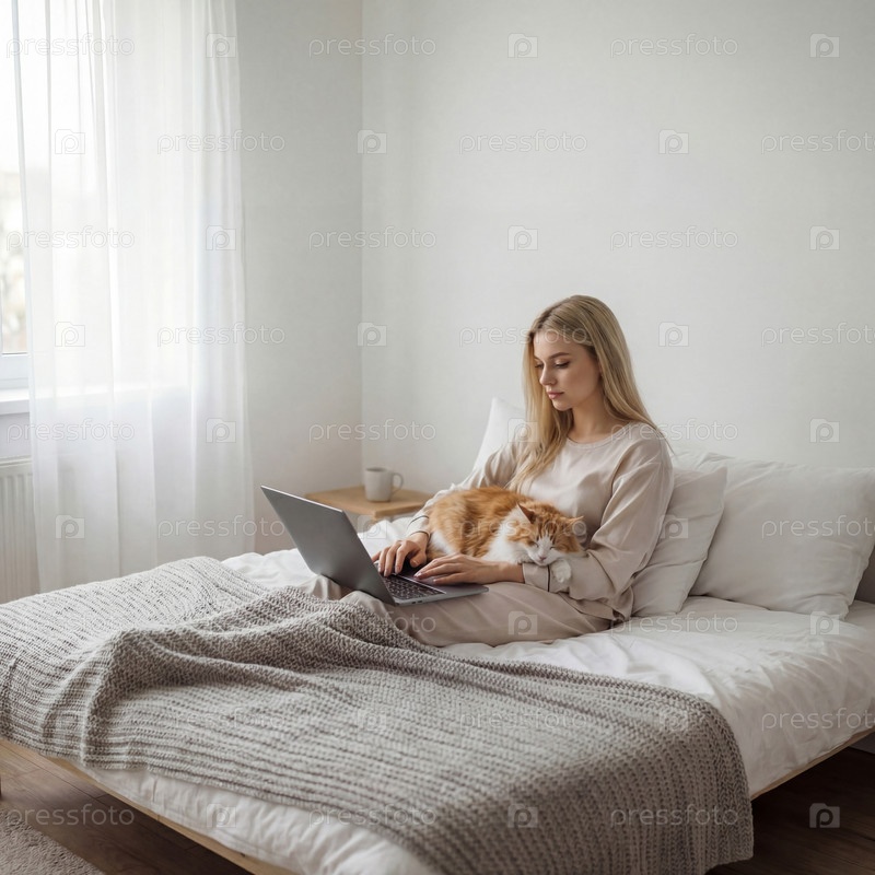 Уютное утро дома: женщина работает на ноутбуке в кровати с рыжим котом на коленях в светлой минималистичной спальне