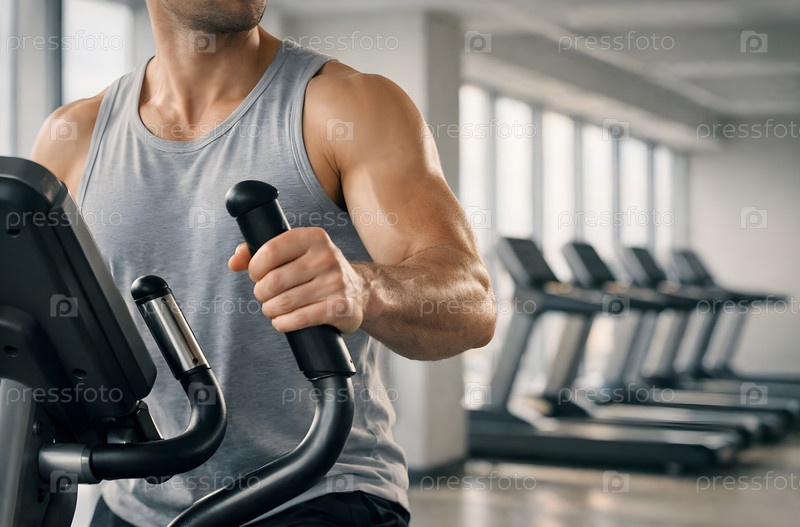 Крупный план мужчины в майке на эллиптическом тренажере в современном тренажерном зале: кардиотренировка, рельефные мышцы и ряд беговых дорожек на заднем плане