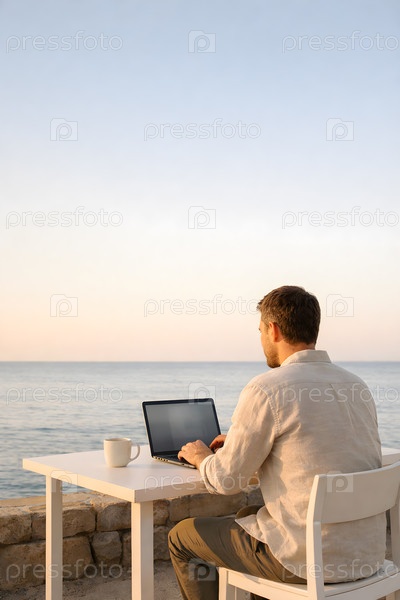 Удаленная работа у моря: мужчина за ноутбуком и чашкой кофе на террасе с видом на океан на закате