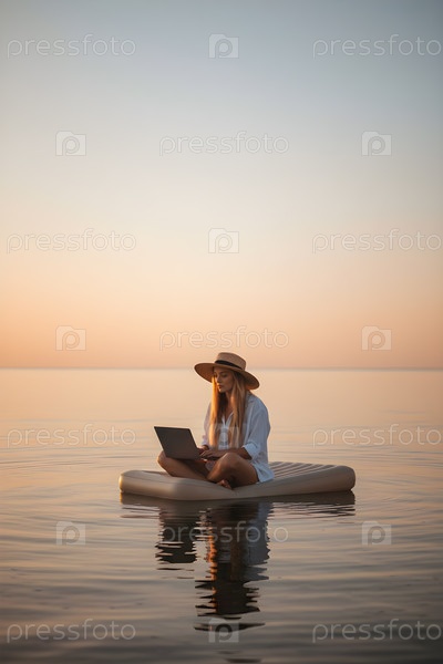 Удаленная работа на рассвете: женщина в соломенной шляпе сидит с ноутбуком на надувном матрасе посреди спокойного моря при мягком золотом свете