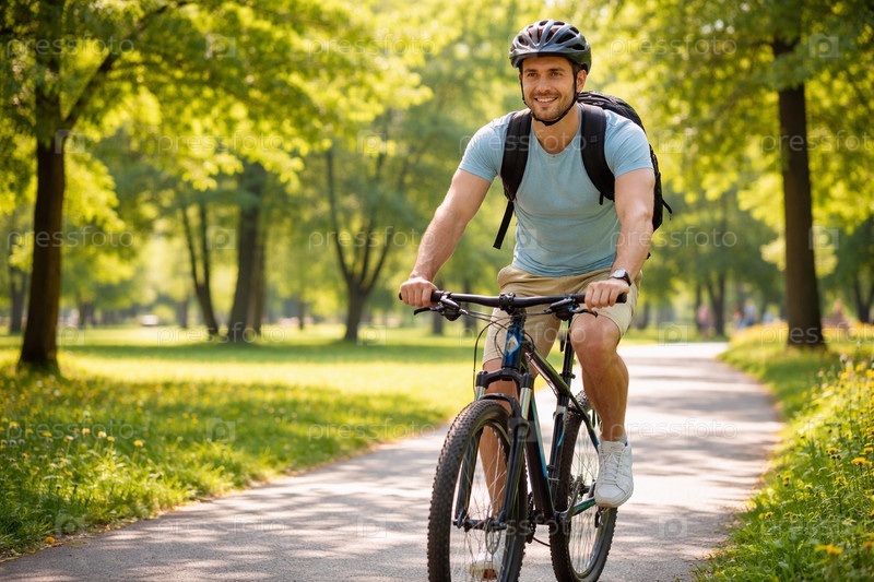 Велосипедист на горном велосипеде в летнем зеленом парке: активная прогулка по солнечной аллее в шортах, футболке, со шлемом и рюкзаком