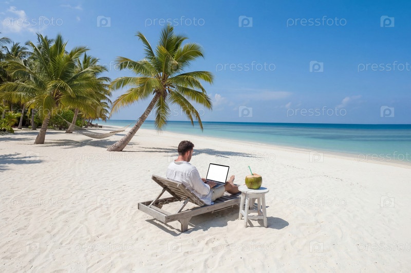 Удаленная работа на тропическом пляже: мужчина с ноутбуком на деревянном шезлонге под пальмами, кокосовый напиток на столике, белый песок и бирюзовая гладь океана — концепция digital nomad и пляжного офиса