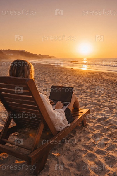 Удаленная работа на пляже на закате — женщина с ноутбуком на деревянном шезлонге у моря
