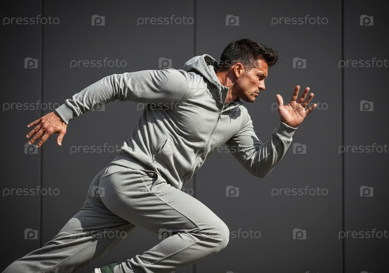 Динамичное изображение бегуна в сером спортивном костюме на старте — взрывной спринт, уличная фитнес-тренировка, энергичная мужская атлетика на фоне минималистичной серой стены