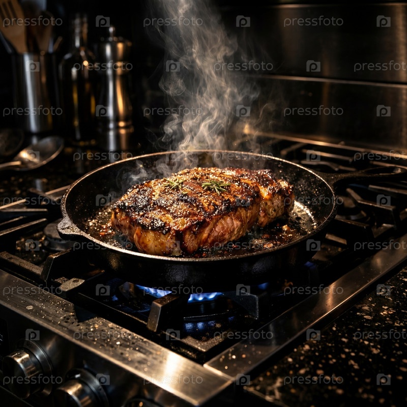 Сочный рибай из говядины на чугунной сковороде на газовой плите, интенсивная карамелизация и шипение с паром и дымом, украшенный веточкой розмарина — аппетитная кулинарная фотография