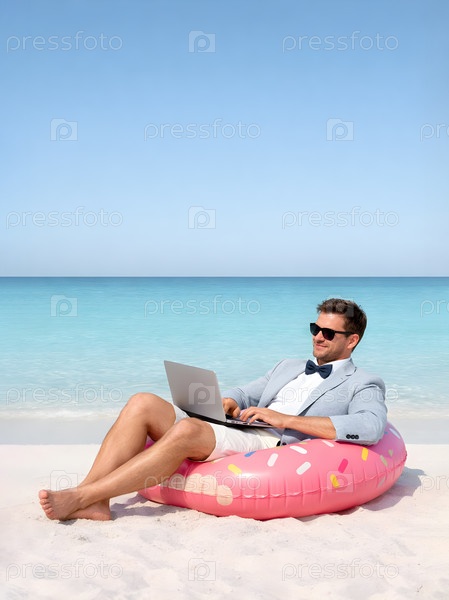 Деловой отдых на пляже: мужчина в пиджаке и бабочке работает на ноутбуке, лежа на розовом надувном круге‑пончике на белом песке у бирюзового моря