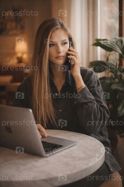 Удаленная работа в кафе: женщина разговаривает по телефону и работает за ноутбуком в теплом уютном интерьере