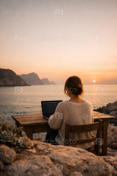 Удаленная работа на закате: женщина-фрилансер за деревянным столом с ноутбуком на скалистом побережье в золотой час, спокойное море и горы на горизонте