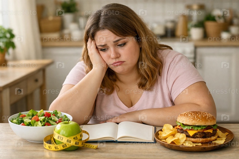 Женщина за кухонным столом раздумывает над выбором между здоровым салатом и яблоком со сантиметровой лентой и аппетитным бургером с чипсами, открытая тетрадь на столе — концепция диеты, пищевого выбора и борьбы с искушением