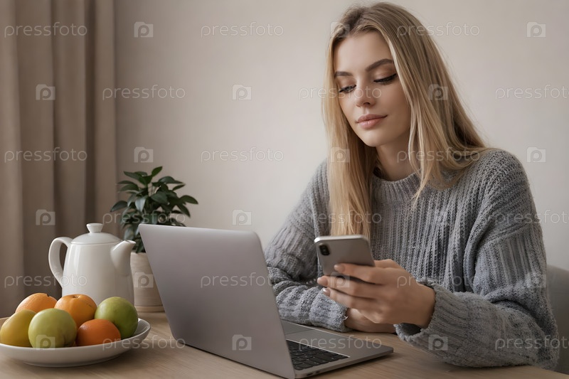 Удаленная работа и повседневный комфорт: человек в уютном свитере с ноутбуком и смартфоном за столом, чайник и миска с фруктами в светлом домашнем интерьере