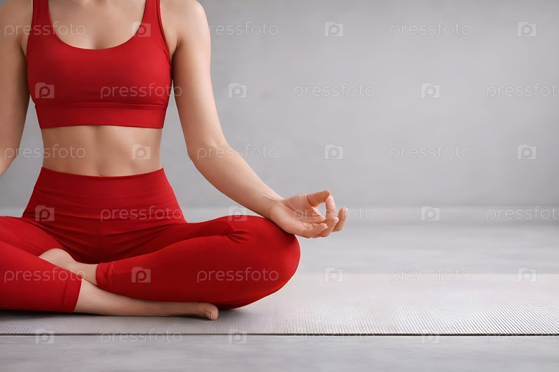 Женщина в красном спортивном комплекте в позе лотоса на йога‑мате — медитация, расслабление и фитнес на светлом минималистичном фоне