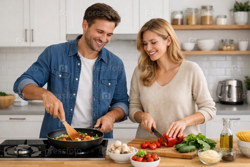 Молодая пара готовит вместе на современной светлой кухне: мужчина обжаривает разноцветные овощи в сковороде, женщина аккуратно нарезает болгарский перец и помидоры для здорового домашнего ужина