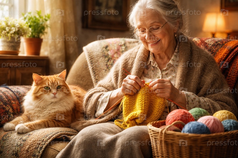 Пожилая женщина в уютной гостиной вяжет спицами желтый свитер рядом с рыжим котом и корзиной клубков пряжи — теплый домашний интерьер, рукоделие и комфорт