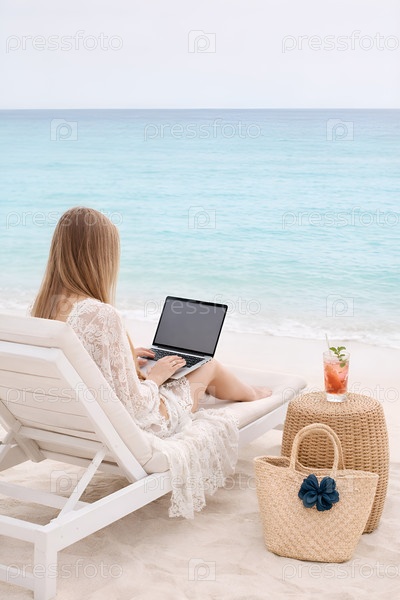 Женщина в летнем платье работает на ноутбуке на шезлонге у бирюзового моря с коктейлем и плетеной сумкой — удаленная работа и отдых на пляже