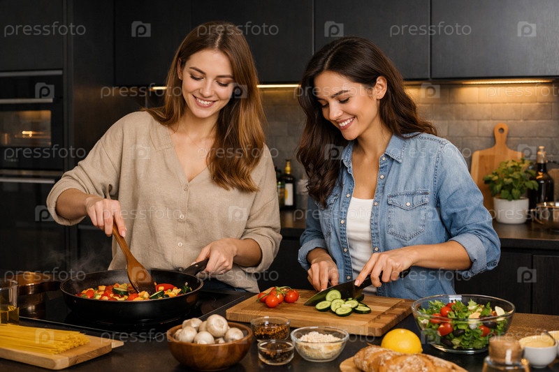 Современная домашняя кухня: две женщины готовят ужин вместе — обжарка разноцветных овощей в сковороде и аккуратная нарезка огурцов на деревянной доске, свежие ингредиенты и салат на столе