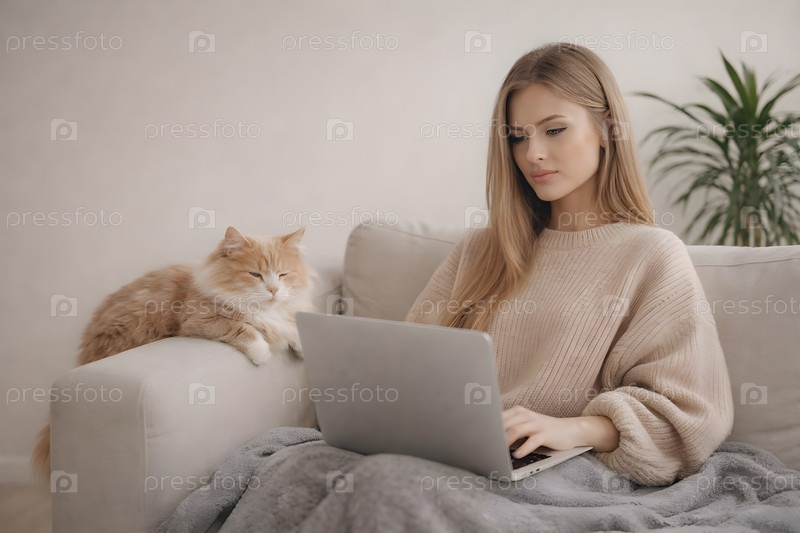 Молодая женщина в уютном вязаном свитере работает за ноутбуком на диване дома, рядом лежит пушистый кот — спокойная интерьерная сцена дистанционной, удаленной работы