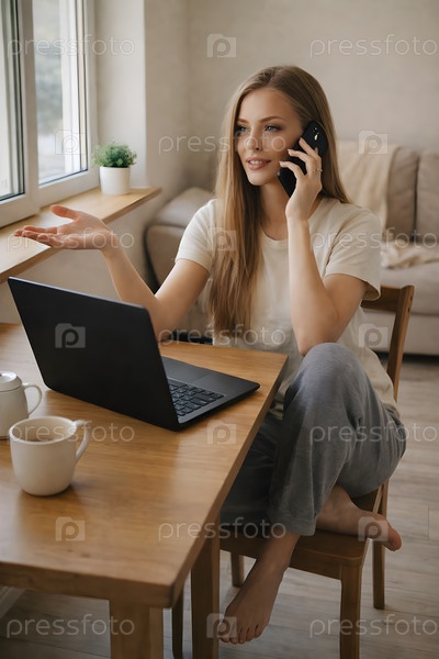 Удаленная работа из дома: молодая женщина разговаривает по телефону за деревянным столом с открытым ноутбуком и чашкой кофе в уютной светлой квартире