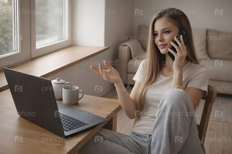 Разговор по телефону во время удаленной работы: женщина сидит за ноутбуком в уютной домашней гостиной с кружкой чая