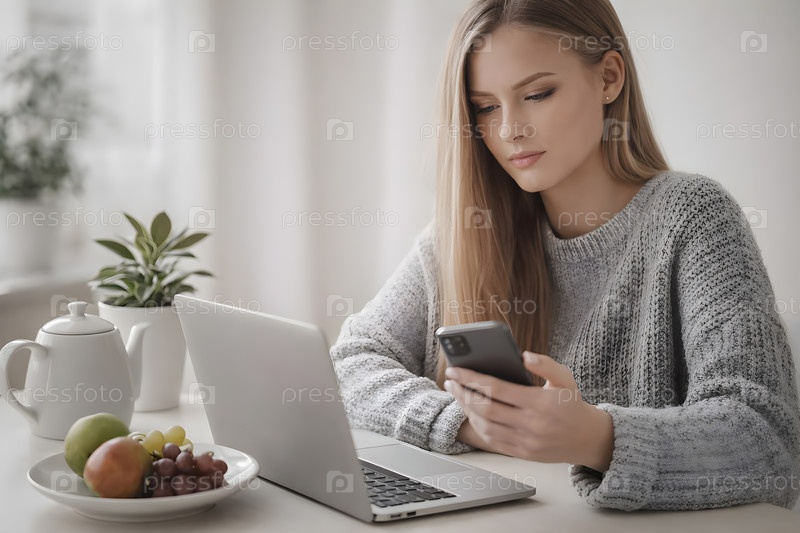 Молодая женщина в уютном свитере работает за ноутбуком и проверяет смартфон за кухонным столом с чашкой чая и тарелкой фруктов в светлом минималистичном интерьере