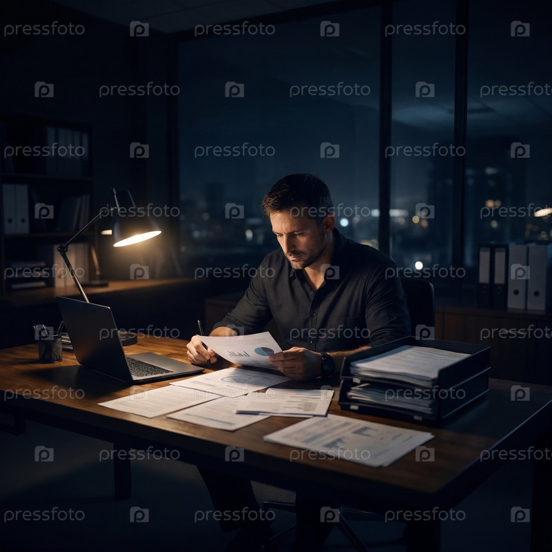 Вечерний офис: деловой мужчина работает допоздна за деревянным столом с ноутбуком, стопкой документов и финансовыми отчетами при теплом свете настольной лампы