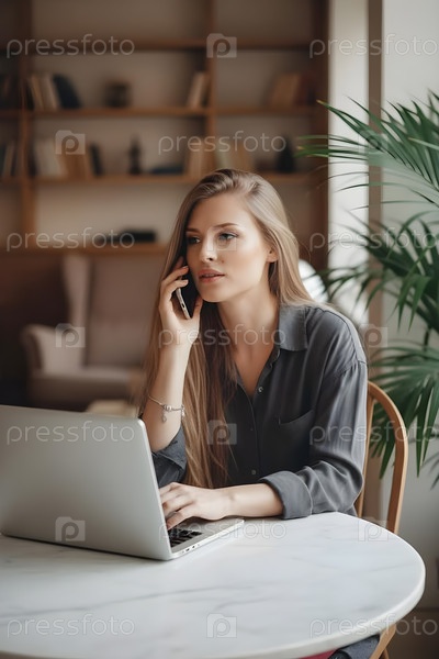 Удаленная работа на дому: молодая женщина разговаривает по смартфону и печатает на ноутбуке за круглым столом в уютной гостиной с книжной полкой и комнатным растением