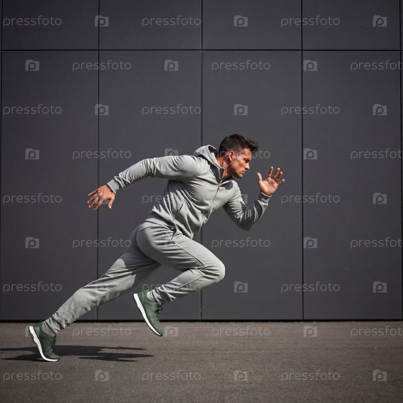 Динамичный мужчина-спортсмен в сером спортивном костюме выполняет старт спринта на фоне минималистичной темно-серой стеновой панели, боковой профиль, экспрессия скорости и мощи