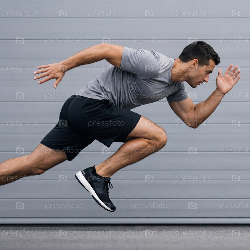 Атлетический мужчина в профиле на взрывном старте: динамичное фото бегуна в серой футболке и черных шортах на нейтральном городском фоне
