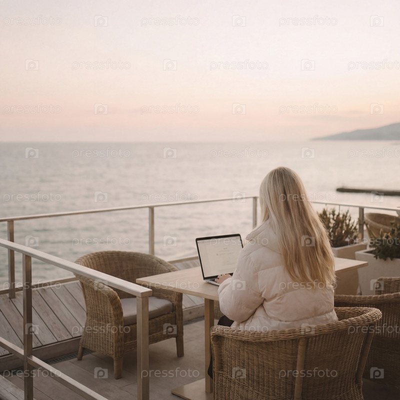 Удаленная работа на террасе у моря на закате: женщина в пуховике с ноутбуком за плетеным столиком на деревянной веранде, спокойная морская панорама и пастельное небо